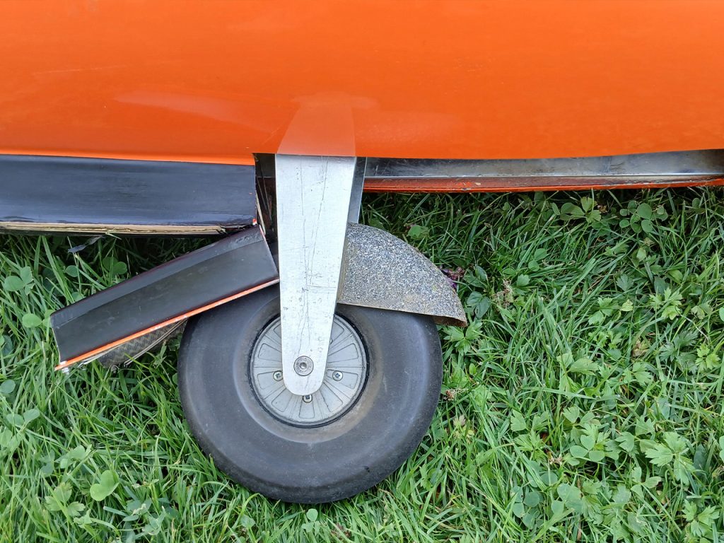 Wenn man alleine am Platz ist, steht das Teil dann irgendwo auf der Landebahn herum und behindert einen. Das Problem war, das es kein käufliches Einziehfahrwerk gab, bei dem im eingezogenen Zustand das Rad noch unten aus dem Rumpf herausschaut. Also habe ich selber eines konstruiert und gebaut. Es funktioniert auch nach mehreren Jahren immer noch zu meiner vollsten Zufriedenheit.